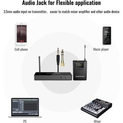 Premium quality: in-Ear monitor system adopts an anti-interference composite circuit, and advanced circuit design to improve sound quality, and high fidelity with no latency, clearing the blind angle to keep signals stable. And the transmitter comes with 3.5mm audio input, easier to connect with mixer, amplifier, or another audio device.