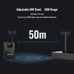 Great UHF Band: wireless in-ear monitor system free of interference by utilizing UHF-wide audio signal transmission (520-600MHz). 10 channels for selecting and up to 10 transmitters working at the same time. Adopt phase-locked PLL technology, stable and reliable performance. Transmission distance up to 50m(164 ft) in an open area, users can to move freely.