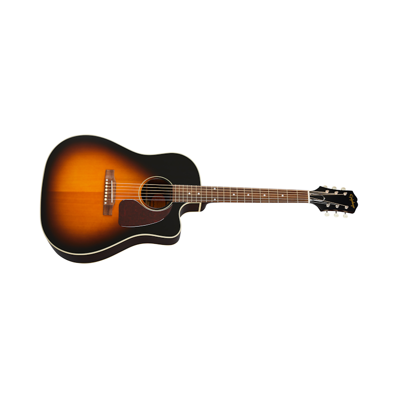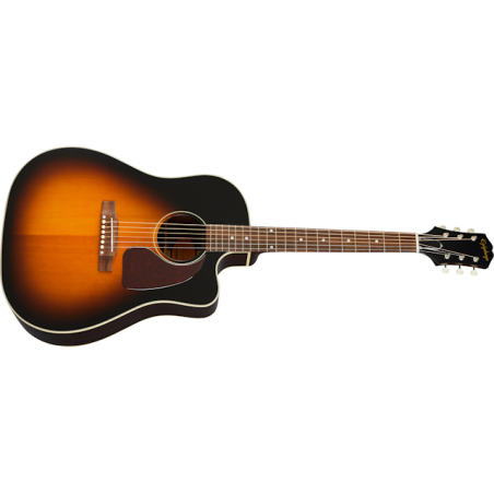 Now Epiphone has released a new Inspired by Gibson™ J-45™ with all of the features players want, including all solid wood construction, a comfortable rounded C neck profile, 20 medium jumbo frets, the 60s style Kalamazoo headstock shape and a gorgeous Aged Vintage Sunburst finish.
